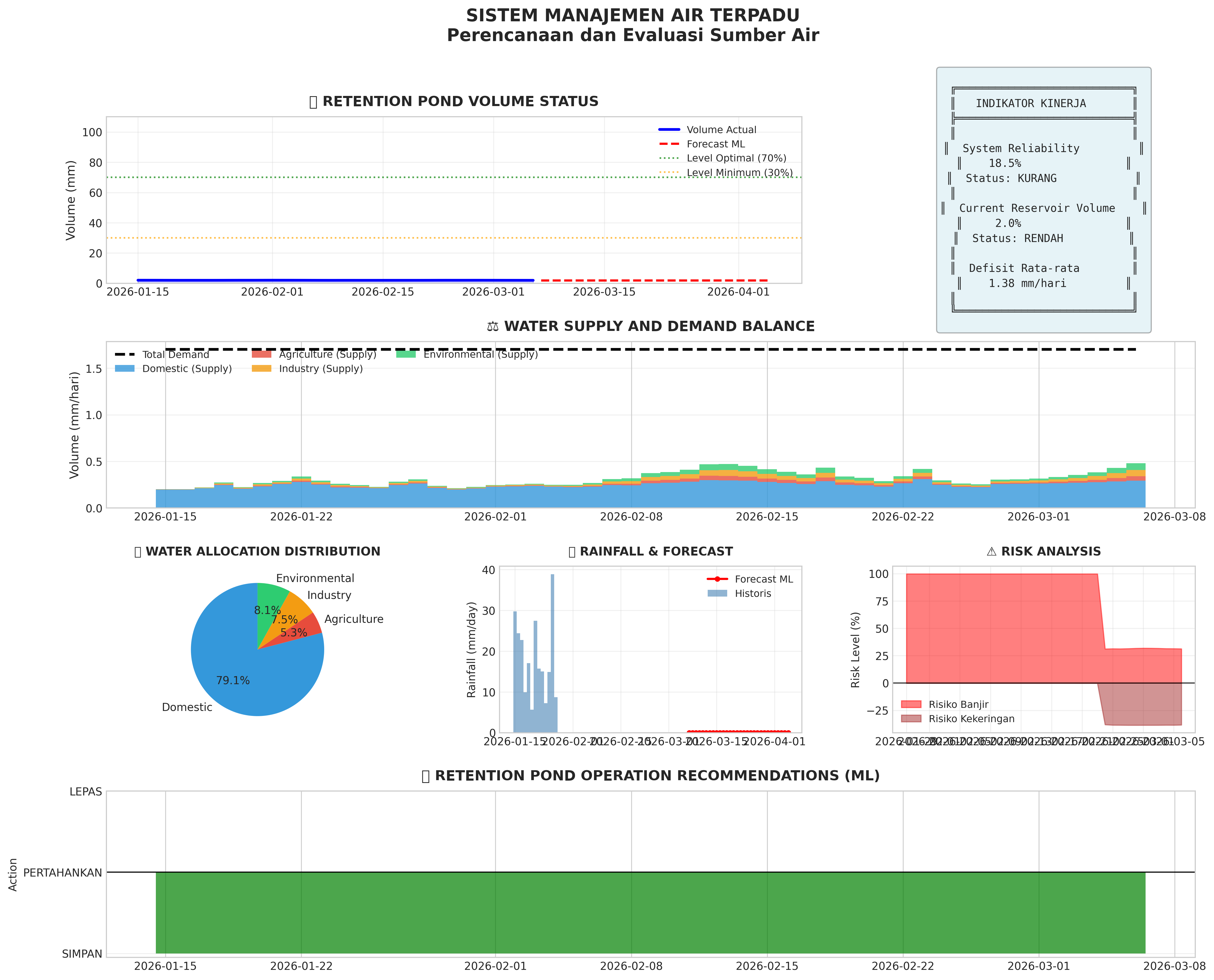 1. Retention pond volume is critical (<20%). Reduce water distribution immediately and activate backup sources.