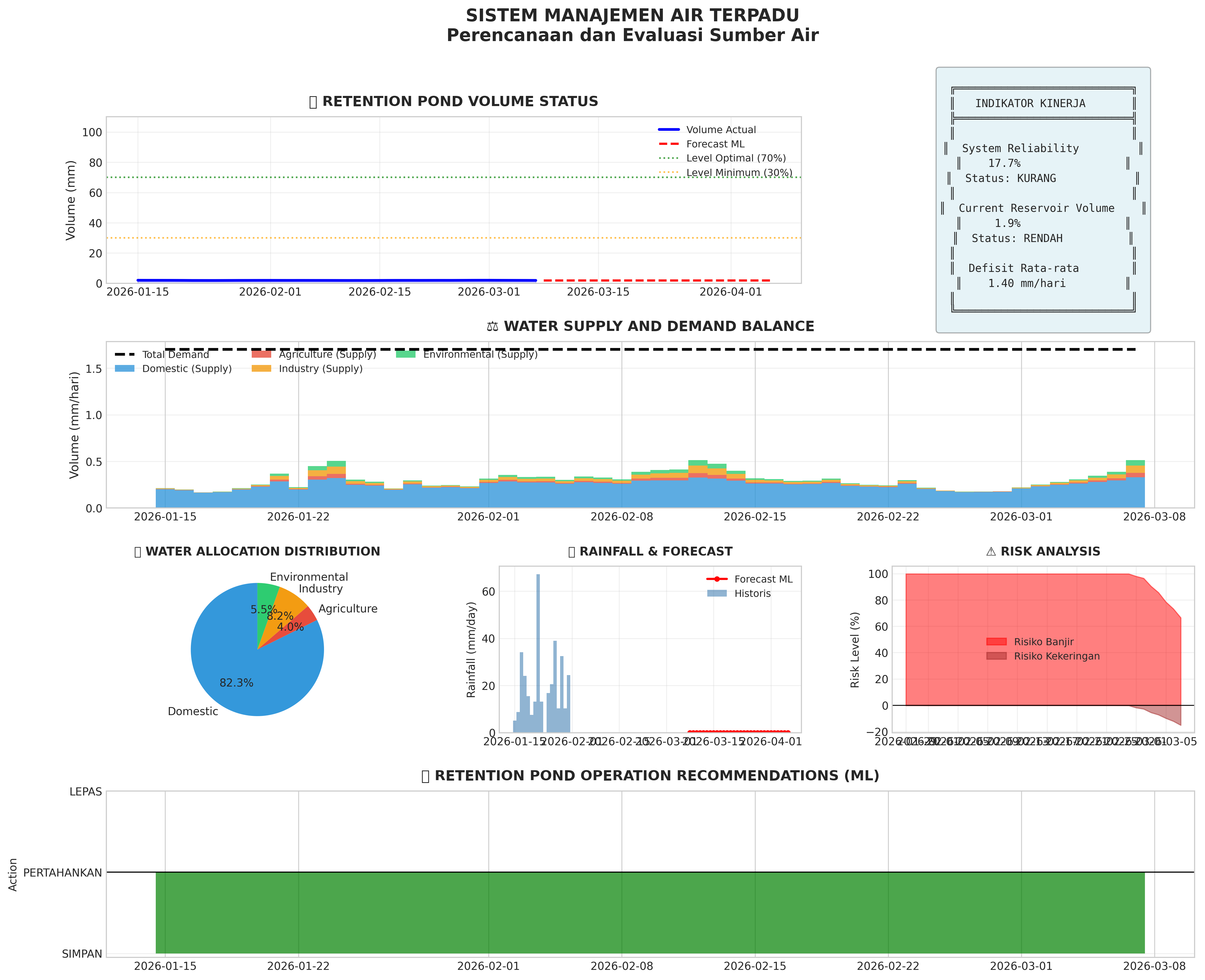 1. Retention pond volume is critical (<20%). Reduce water distribution immediately and activate backup sources.