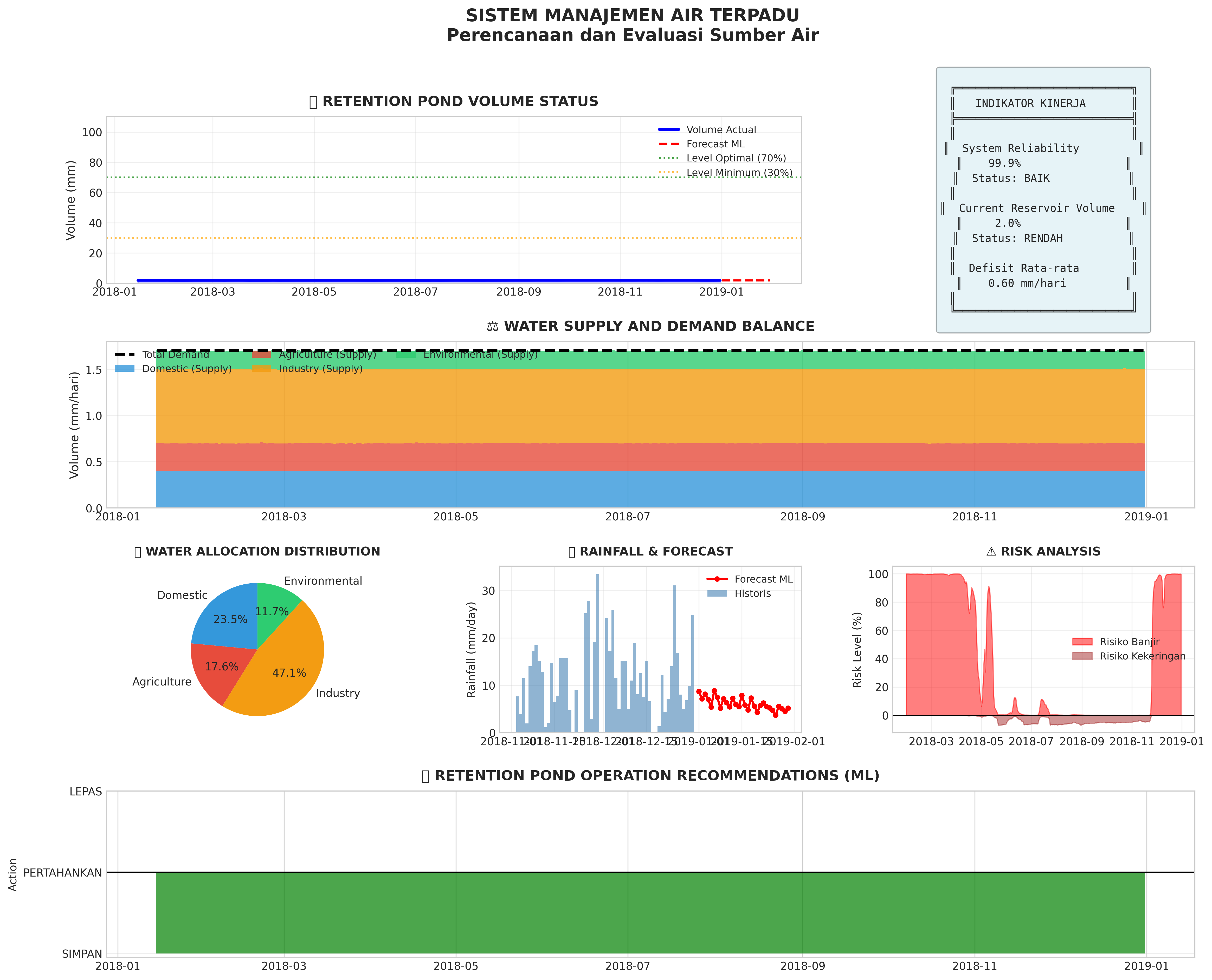 1. Retention pond volume is critical (<20%). Reduce water distribution immediately and activate backup sources.