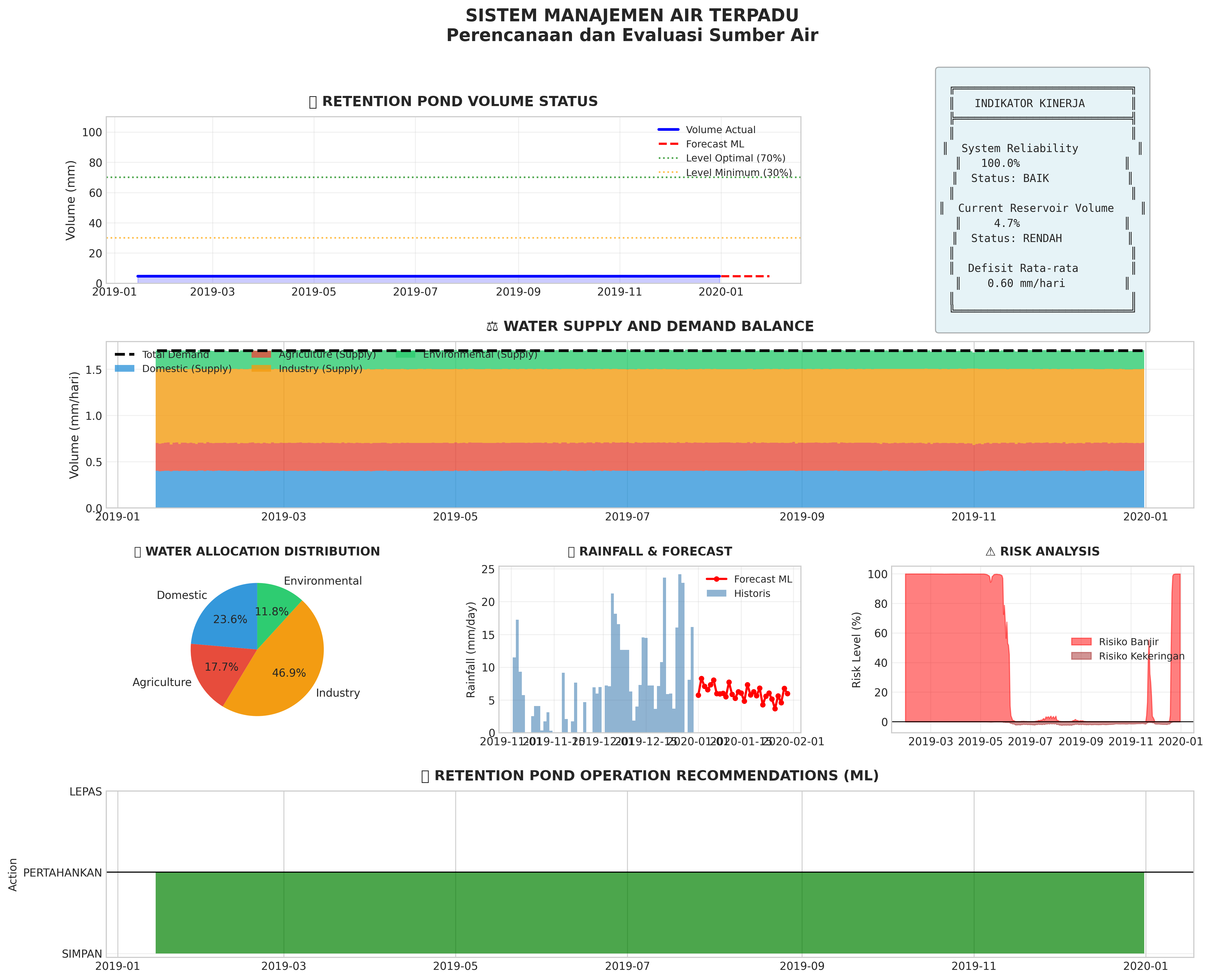 1. Retention pond volume is critical (<20%). Reduce water distribution immediately and activate backup sources.