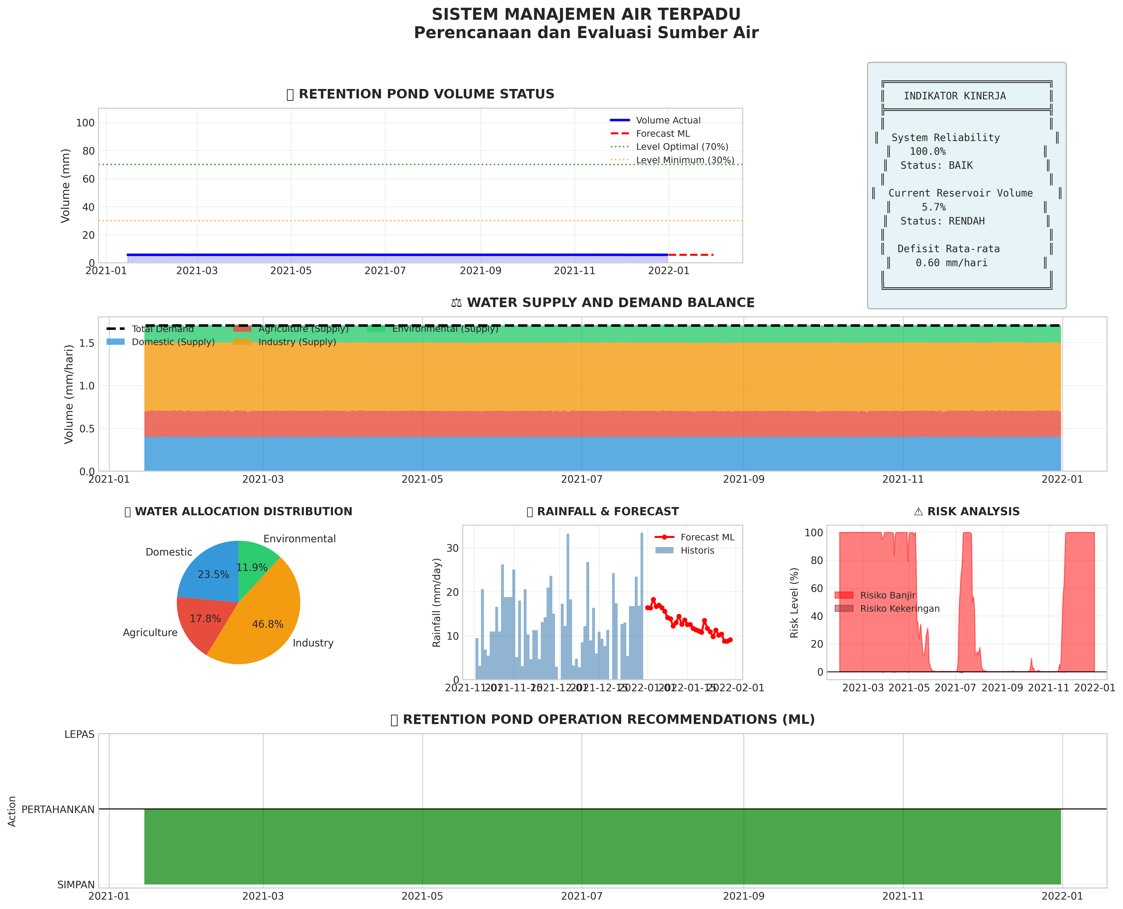 1. Retention pond volume is critical (<20%). Reduce water distribution immediately and activate backup sources.