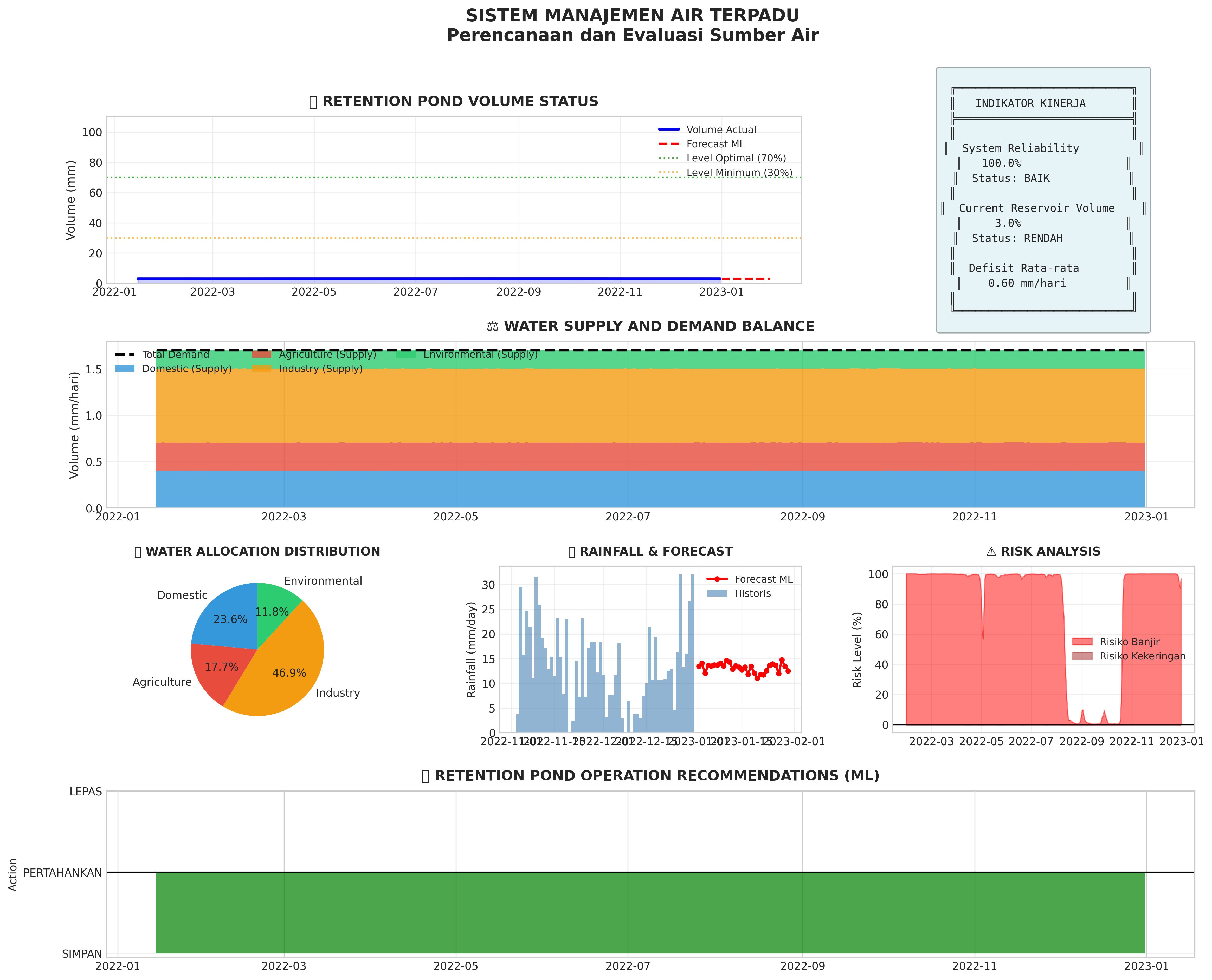 1. Retention pond volume is critical (<20%). Reduce water distribution immediately and activate backup sources.