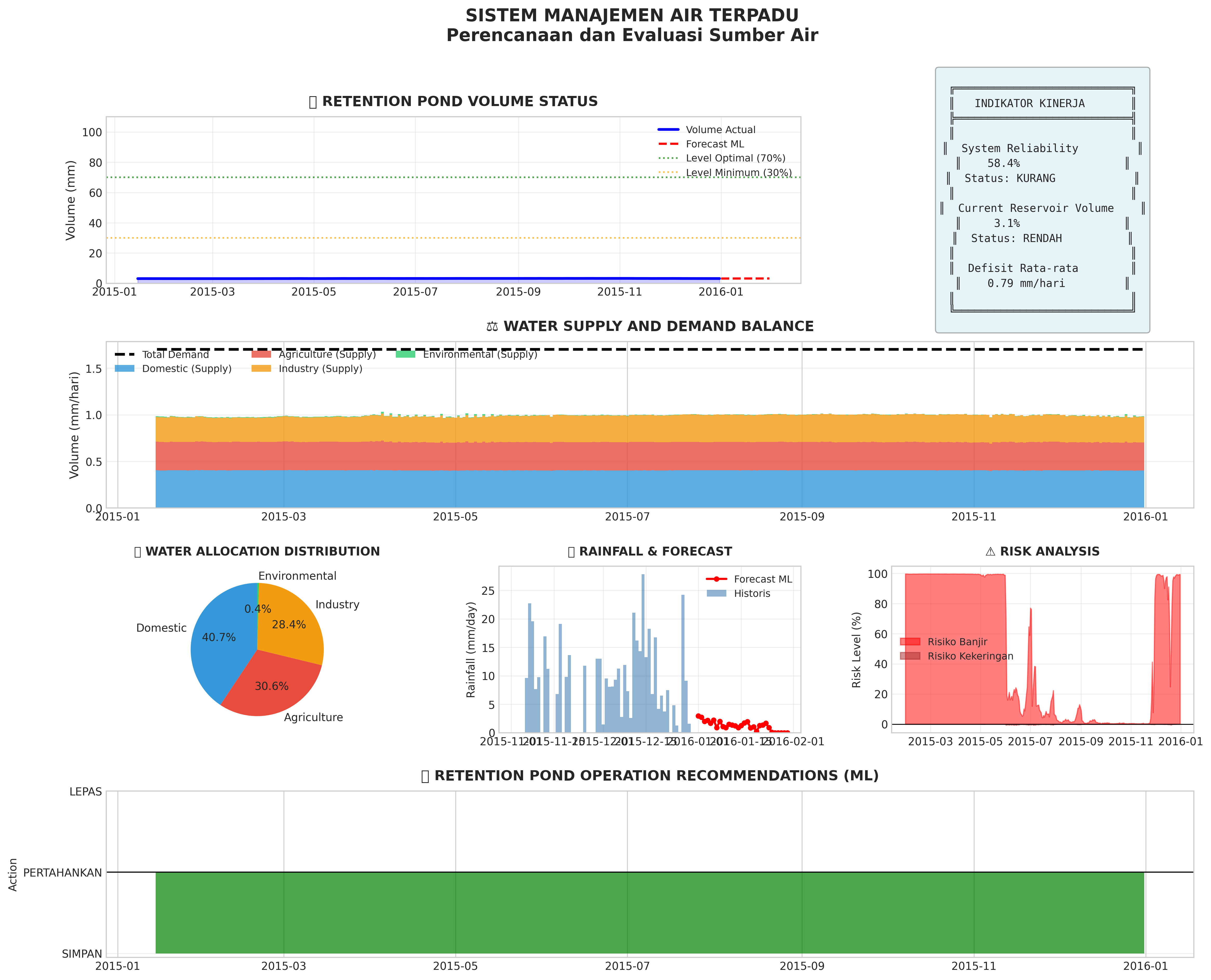 1. Retention pond volume is critical (<20%). Reduce water distribution immediately and activate backup sources.