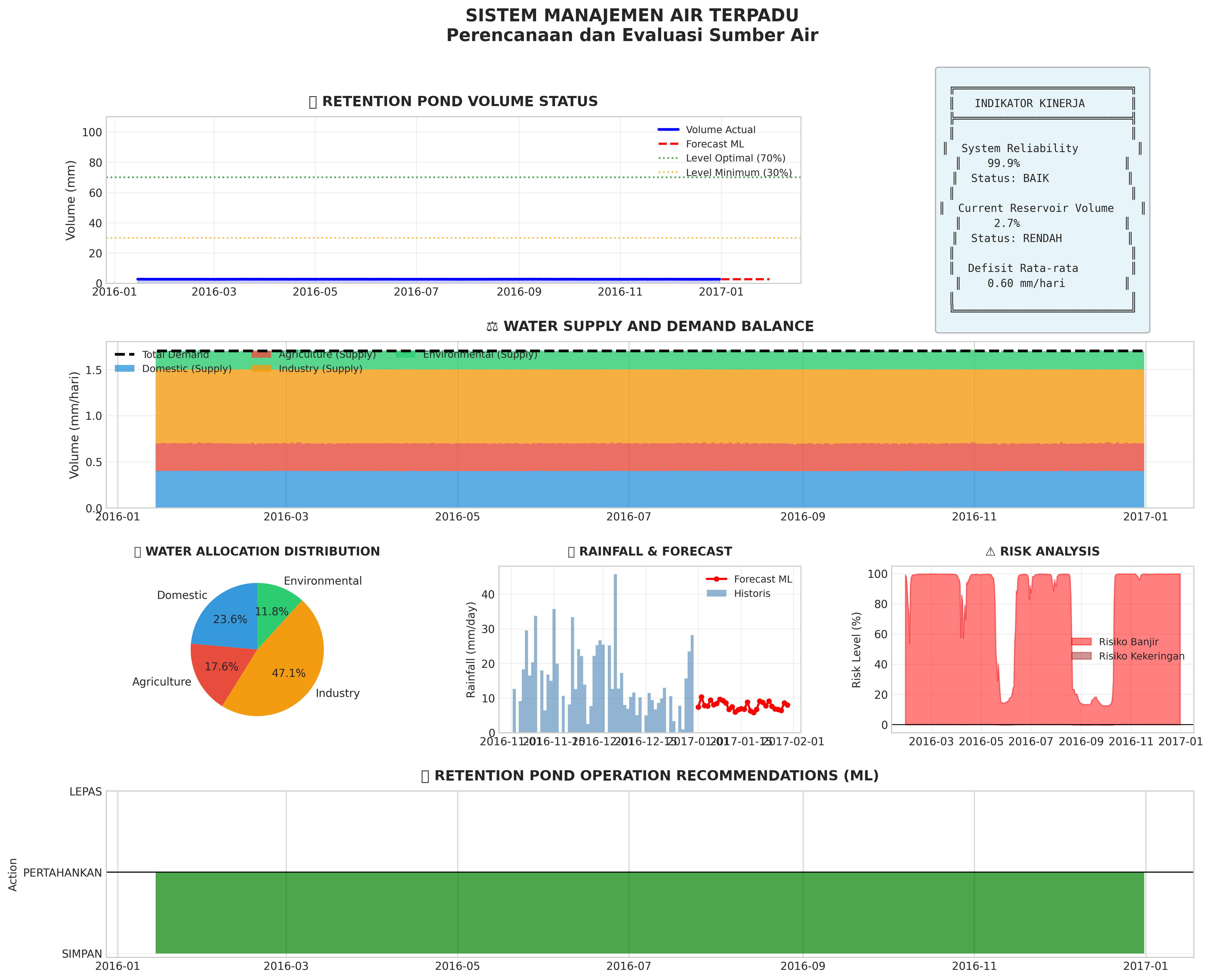 1. Retention pond volume is critical (<20%). Reduce water distribution immediately and activate backup sources.